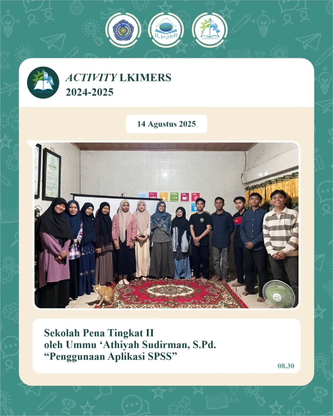 Lembaga Kreativitas Ilmiah Mahasiswa Penelitian dan Penalaran (LKIM-PENA) Universitas Muhammadiyah Makassar kembali menggelar program unggulannya yaitu Sekolah Pena Tingkat 2. Kegiatan yang berlangsung pada Kamis, 14 Agustus 2025 dan Sabtu, 23 Agustus 2025 ini menghadirkan materi “Penggunaan Aplikasi SPSS” dengan suasana pembelajaran yang penuh semangat.