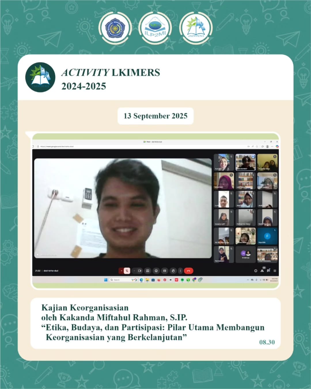 Kegiatan ini bertujuan untuk memberikan pemahaman mendalam kepada para LKIMers mengenai pentingnya membangun organisasi yang tidak hanya aktif bergerak, tetapi juga memiliki fondasi nilai yang kuat. Etika menjadi landasan moral, budaya organisasi berperan menjaga identitas dan jati diri, sementara partisipasi menjadi roh yang menghidupkan setiap dinamika berlembaga.