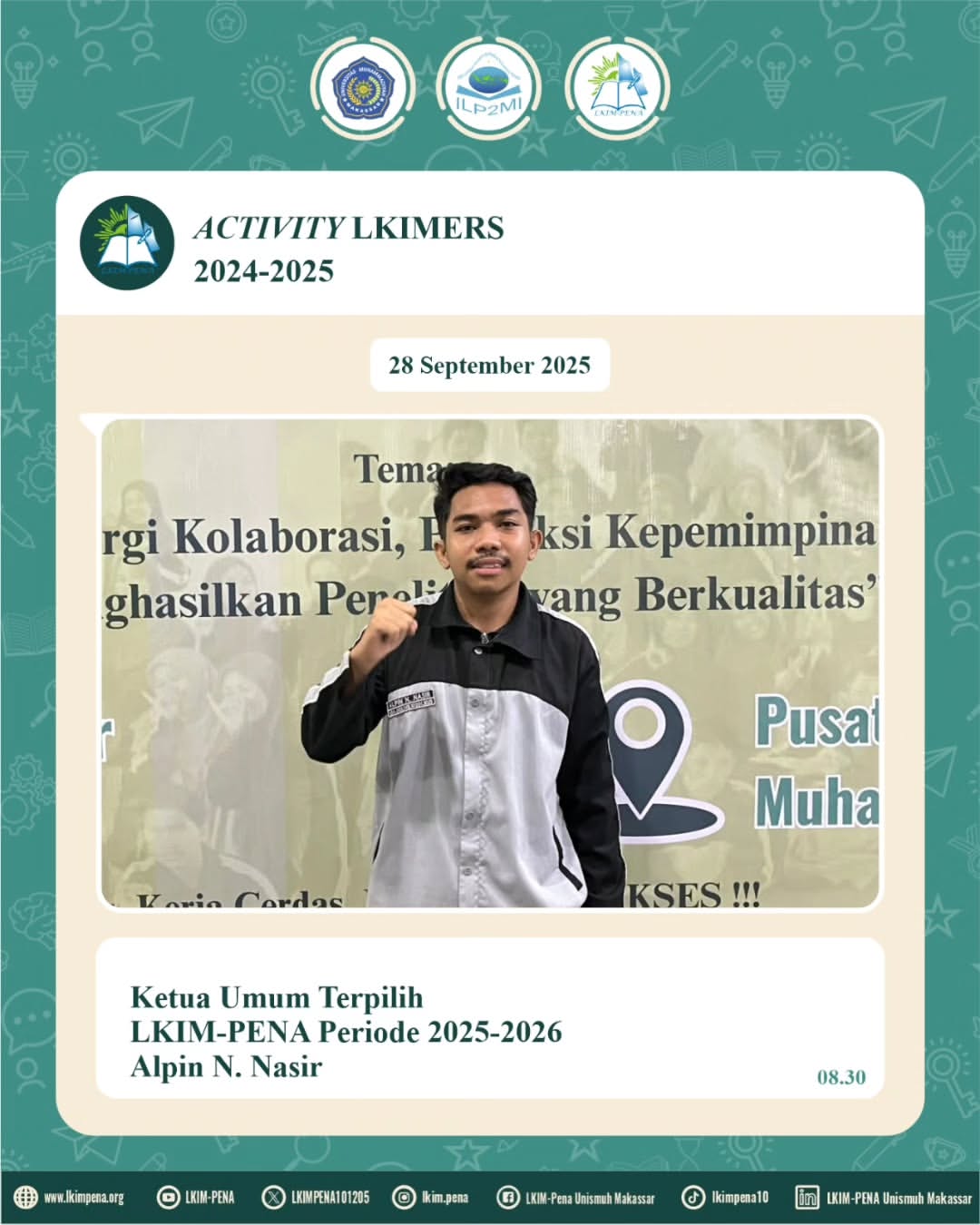 Setelah melalui proses musyawarah yang demokratis dan penuh semangat, Alpin N. Nasir secara resmi terpilih sebagai Ketua Umum LKIM-PENA Unismuh Makassar Periode 2025-2026. Kemenangan ini menutup agenda Musyawarah besar XVIII yang telah berlangsung sejak Sabtu, 27 September 2025.