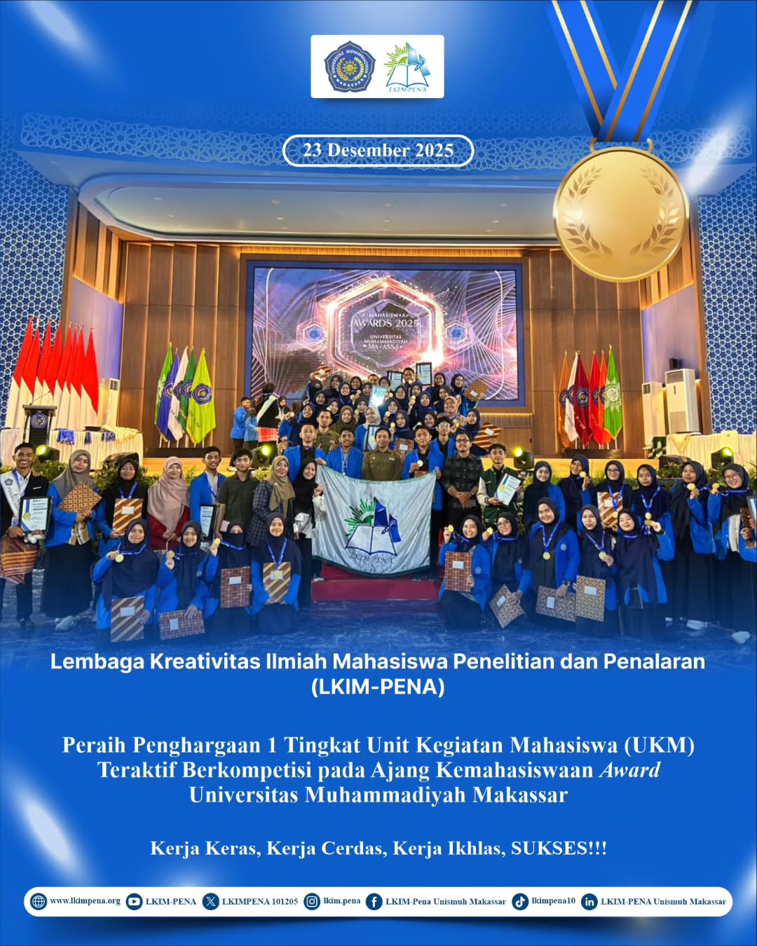 Makassar, 23 Desember 2025 – UKM LKIM-PENA kembali menorehkan prestasi membanggakan dengan meraih Penghargaan 1 Tingkat Unit Kegiatan Mahasiswa (UKM) Teraktif Berkompetisi pada Ajang Kemahasiswaan Award 2025.