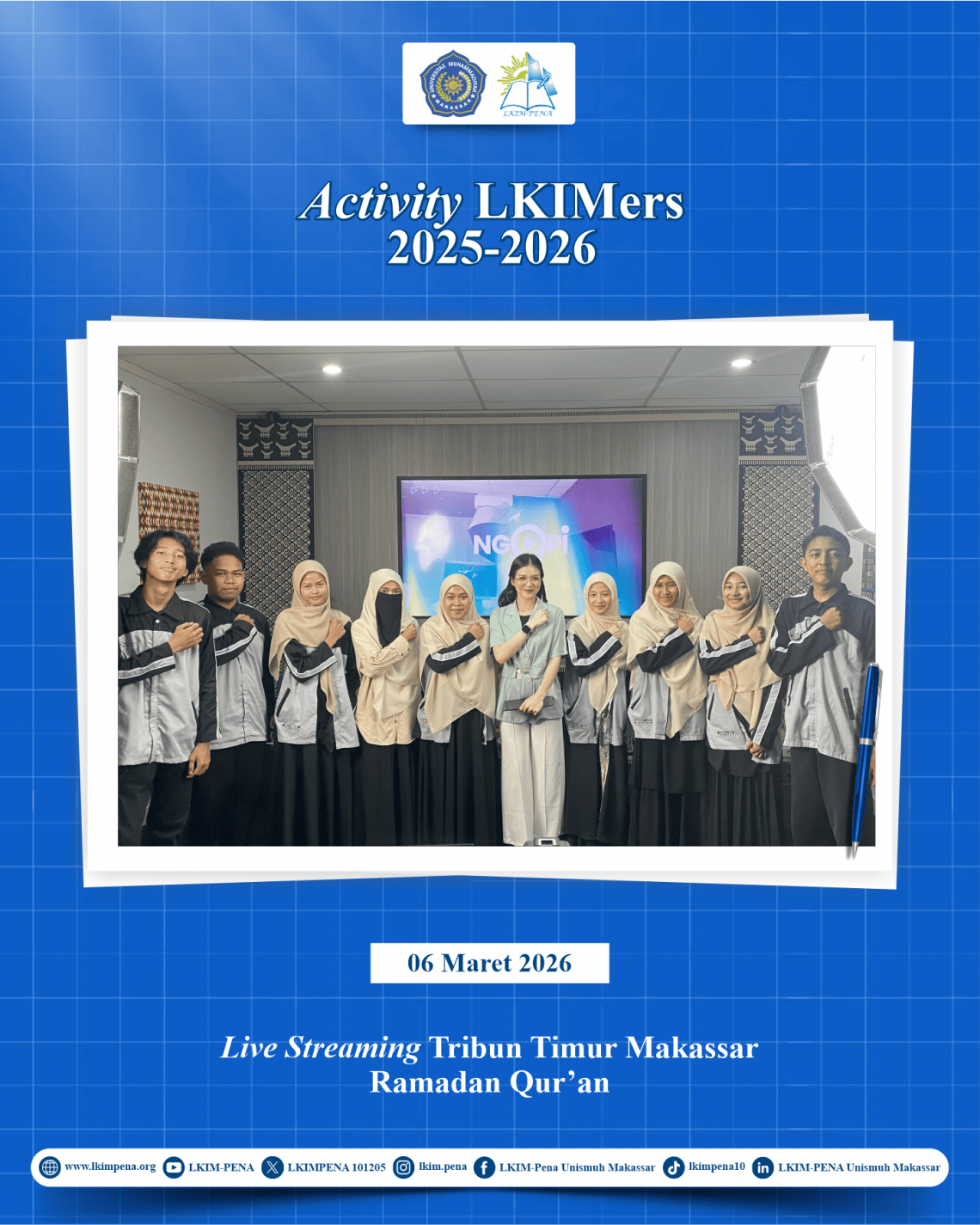 Makassar, 06 Maret 2026 – Semangat Ramadan kembali dihidupkan oleh Lembaga Kreativitas Ilmiah Mahasiswa Penelitian dan Penalaran (LKIM-PENA) Universitas Muhammadiyah Makassar melalui program Ramadan Qur’an yang disiarkan secara langsung melalui kanal Tribun Timur Makassar, pukul 14.00 WITA.