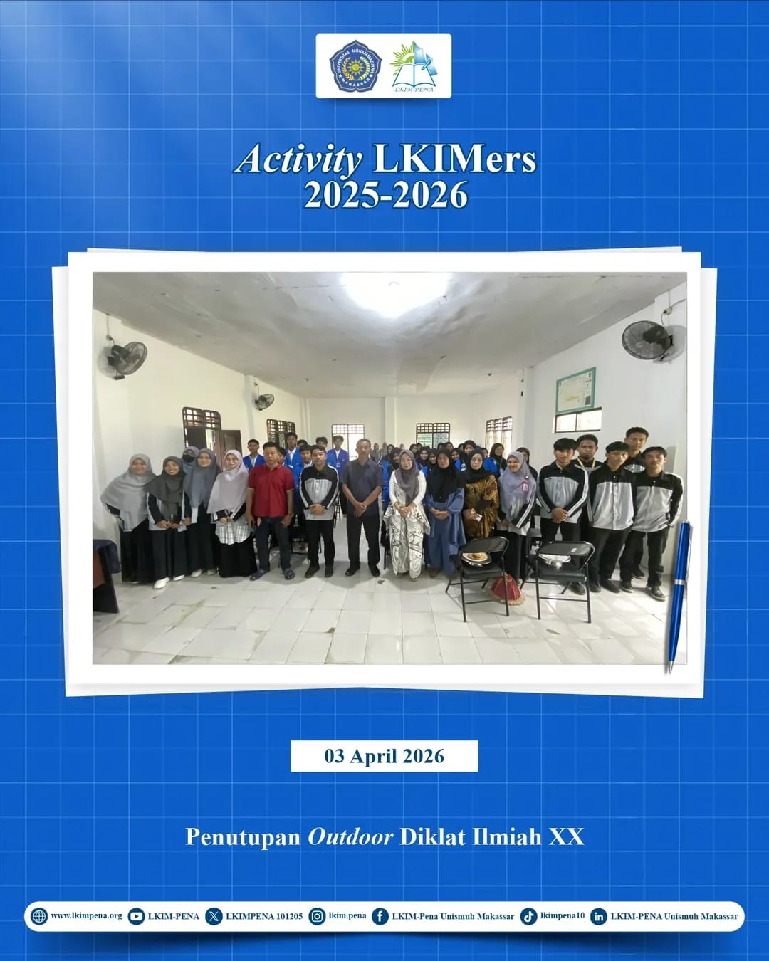 Pallangga, Jumat, 3 April 2026 – Rangkaian kegiatan Outdoor Pendidikan dan Pelatihan (Diklat) Ilmiah XX yang diselenggarakan oleh Lembaga Kreativitas Ilmiah Mahasiswa Penelitian dan Penalaran (LKIM-PENA) resmi ditutup di Desa Pallangga, Kecamatan Pallangga, Kabupaten Gowa.